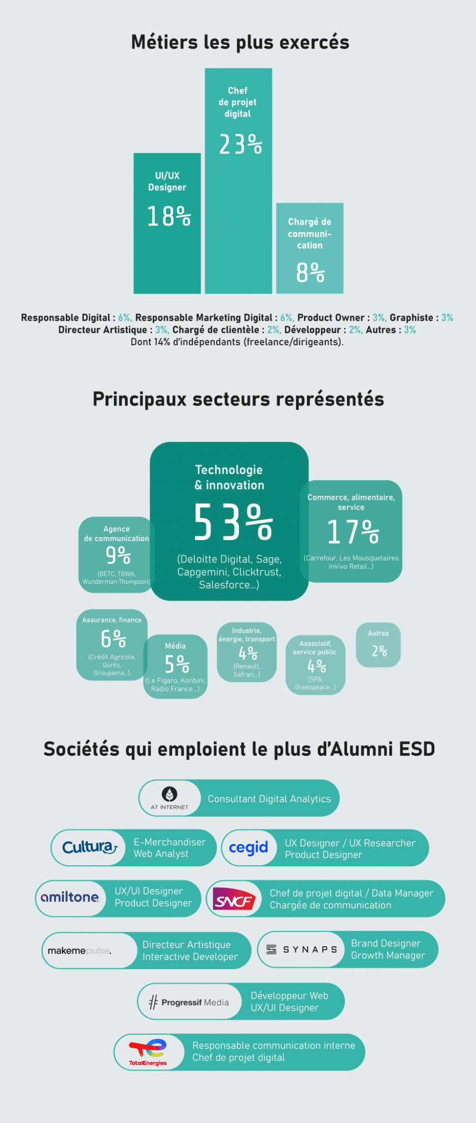 Les Alumni ESD se distinguent par la variété de leurs postes. Au fil des promotions, l'ESD a formé plus de 1000 anciens étudiants aux profils très variés : des professionnels à l'aise à la fois sur la technique, la création ou encore la stratégie digitale.