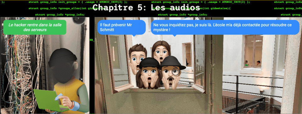 À l’issue du Code Camp, les étudiants maîtrisent les bases HTML, CSS, JS, et sont capables de développer une interface web et de manipuler le célèbre framework bootstrap. Les objectifs du Code Camp : Créatif : réaliser un projet créatif avec ces langages web,Pédagogique : acquérir une culture technique de base sur les langages web (HTML,CSS,JS),Collectif : Apprendre à se connaître avec du team building. Accompagné de Julien Blégean et de JB Dacquet, nos M1 devaient réaliser une BD interactive et animée en HTML/CSS/JS, répondant à un thème précis. Leurs réalisations Chapitre 1 : Le mot de passe Jouer ! Chapitre 4 : L'adresse IP Jouer ! Chapitre 5 : Les audios Jouer !