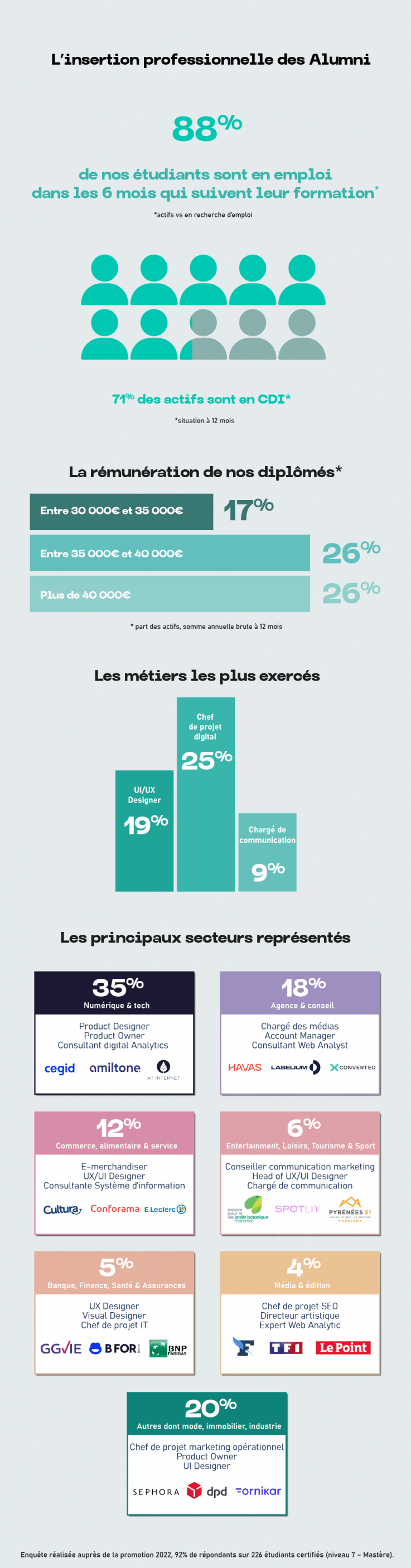 Enquête réalisée auprès de la promotion 2022, 96% de répondants sur 360 étudiants certifiés (niveau 7 – Mastère).